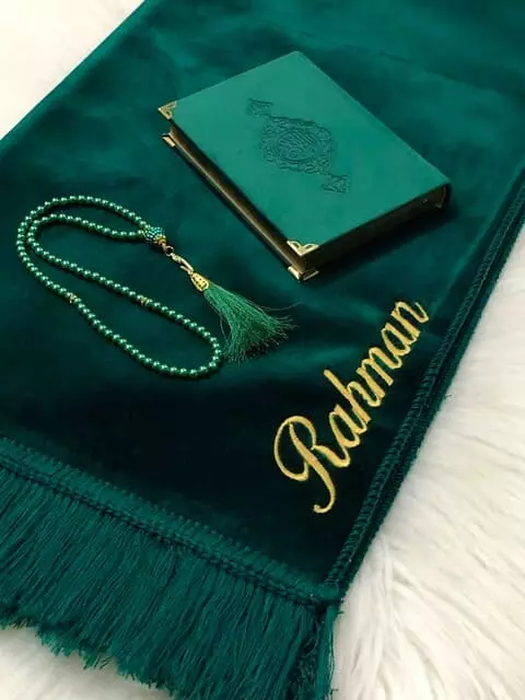 Dieser personalisierte Gebetsteppich mit Namen ist bewusst einfarbig und musterlos gestaltet, um ein konzentriertes Gebet ohne Ablenkung zu ermöglichen.